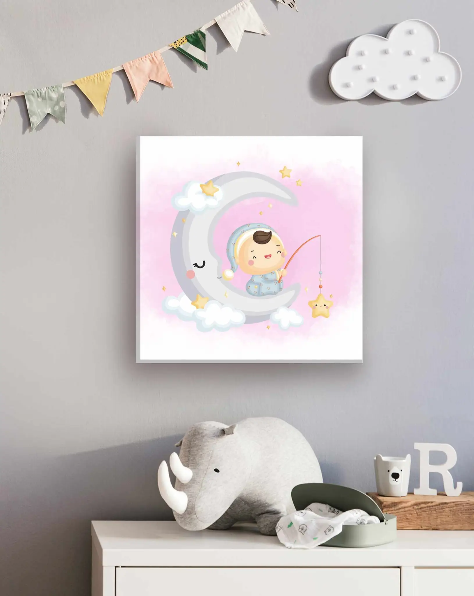 Cuadro en lienzo canvas decorativo bebé sobre luna fondo rosa