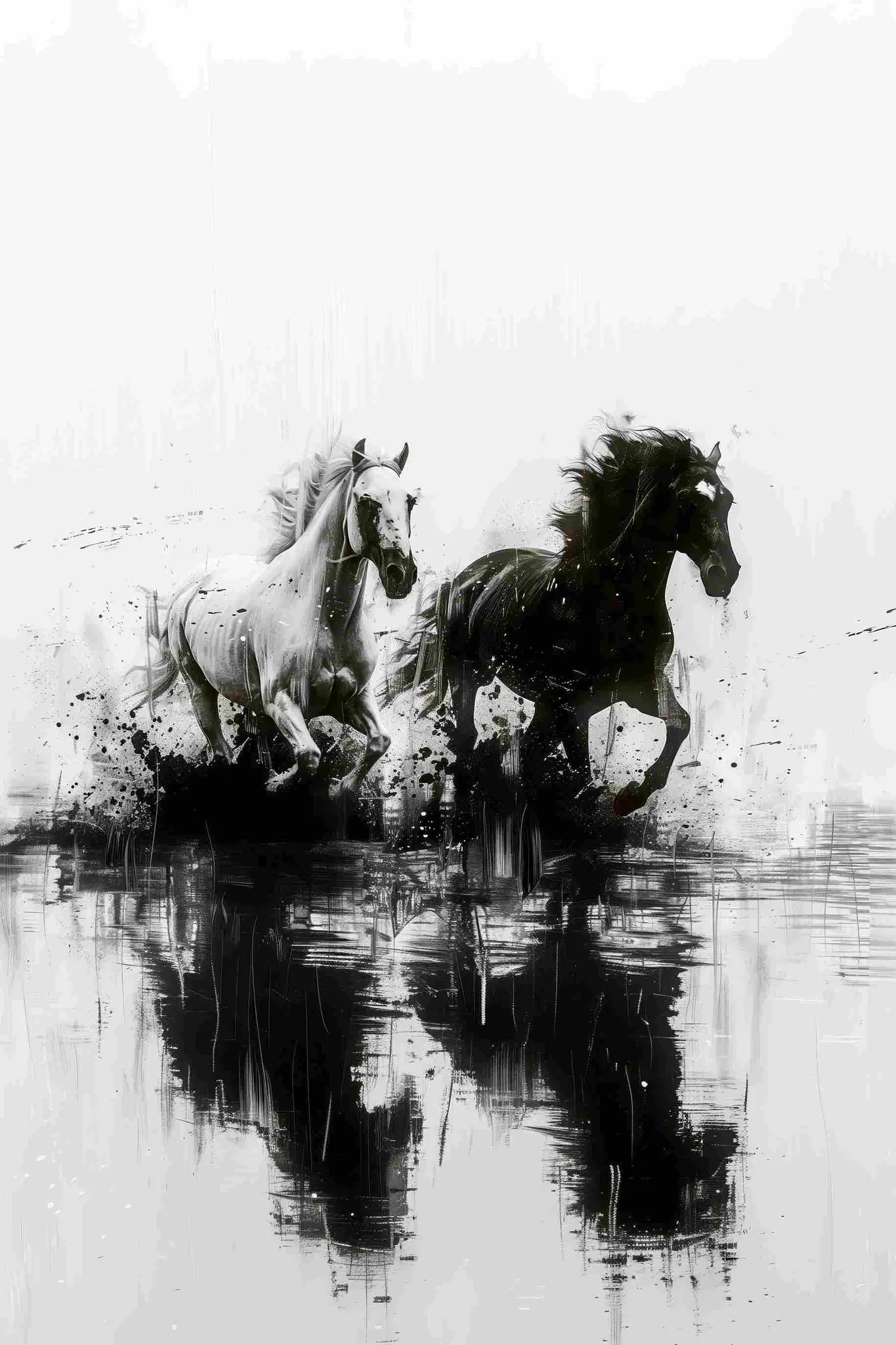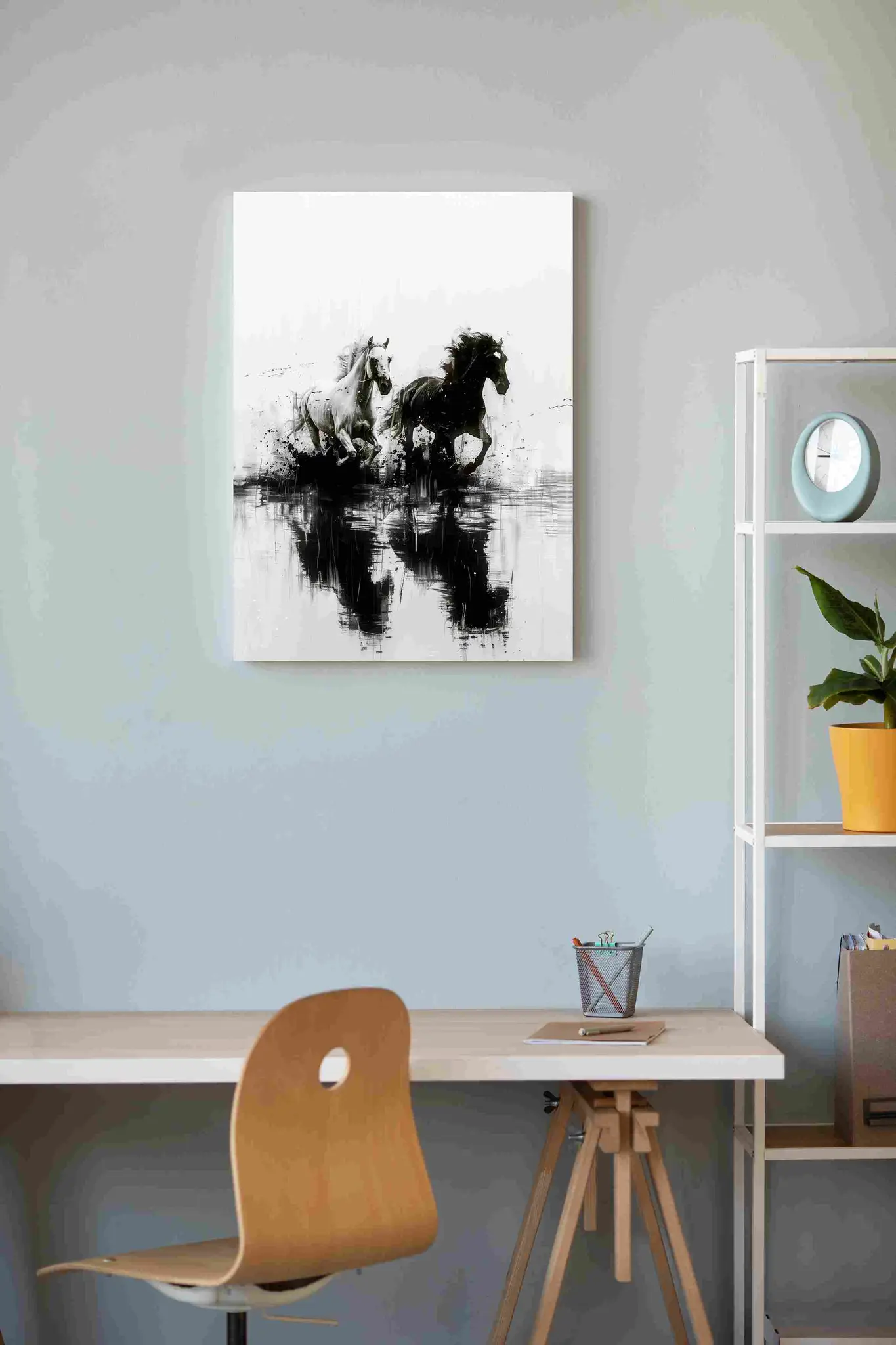 Cuadro en lienzo canvas decorativo caballos en tinta blanco y negro