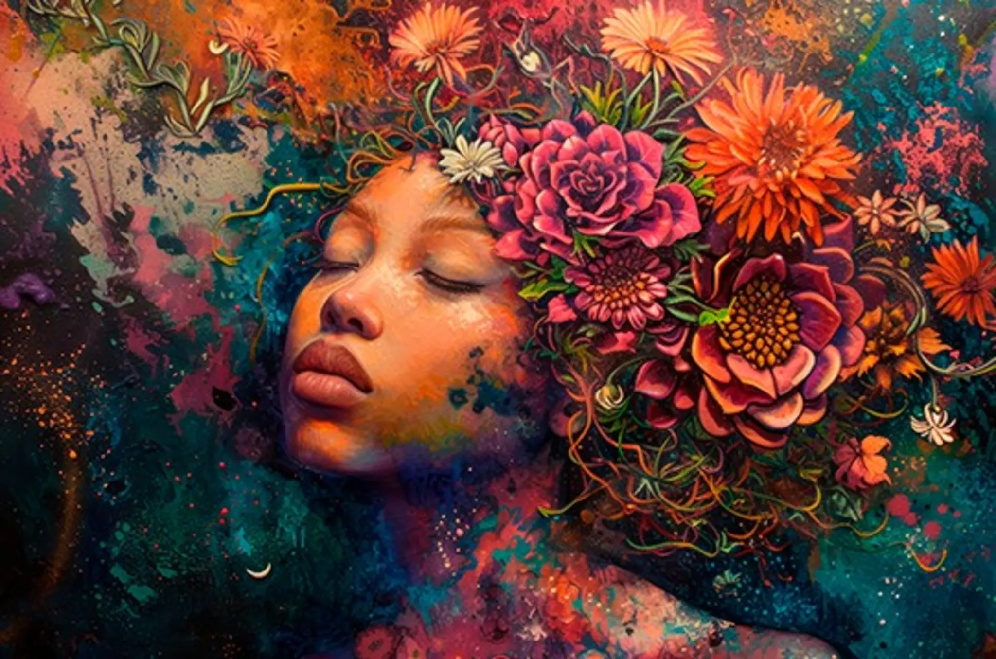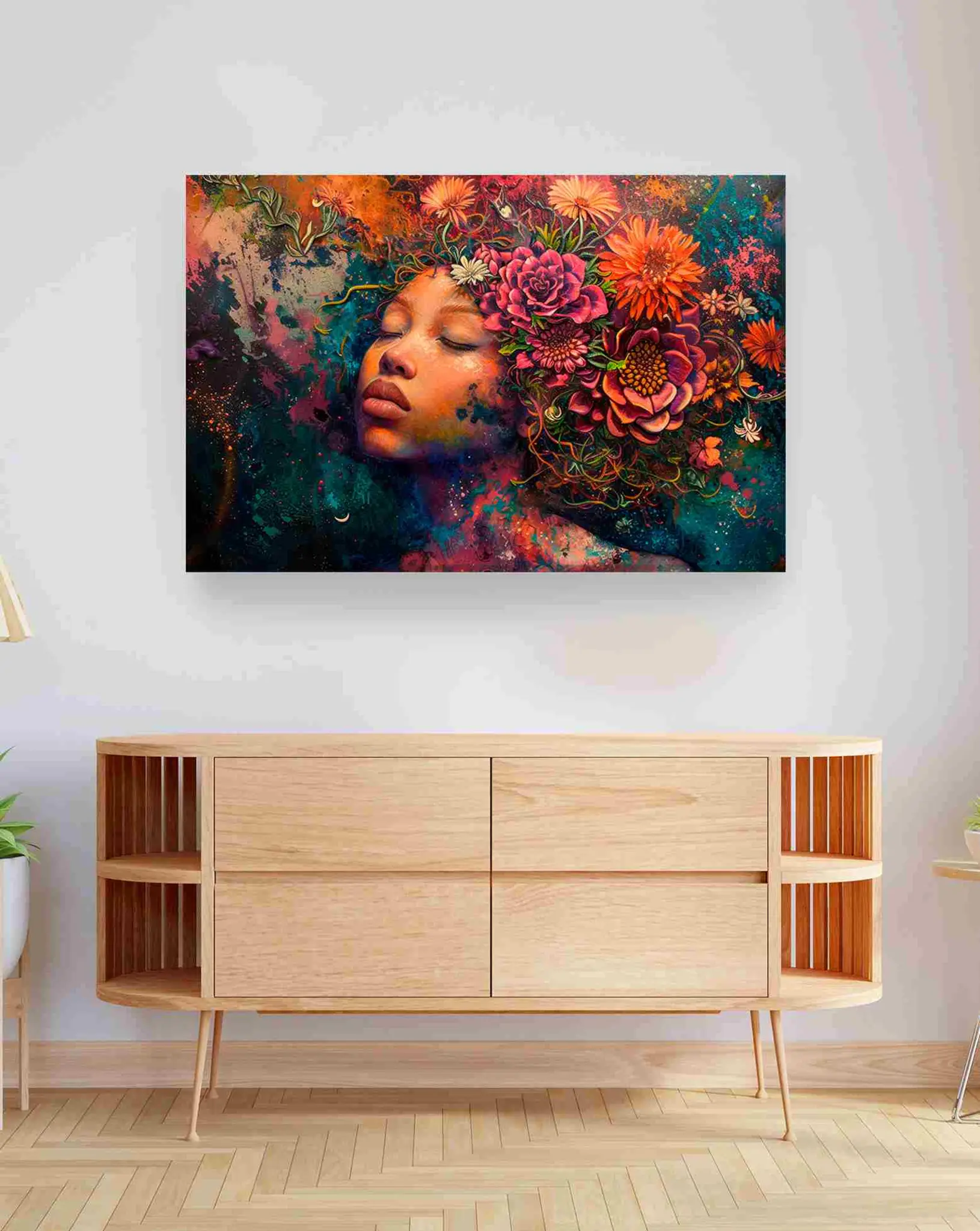 Cuadro en lienzo canvas decorativo mujer con hermoso cabello de flores