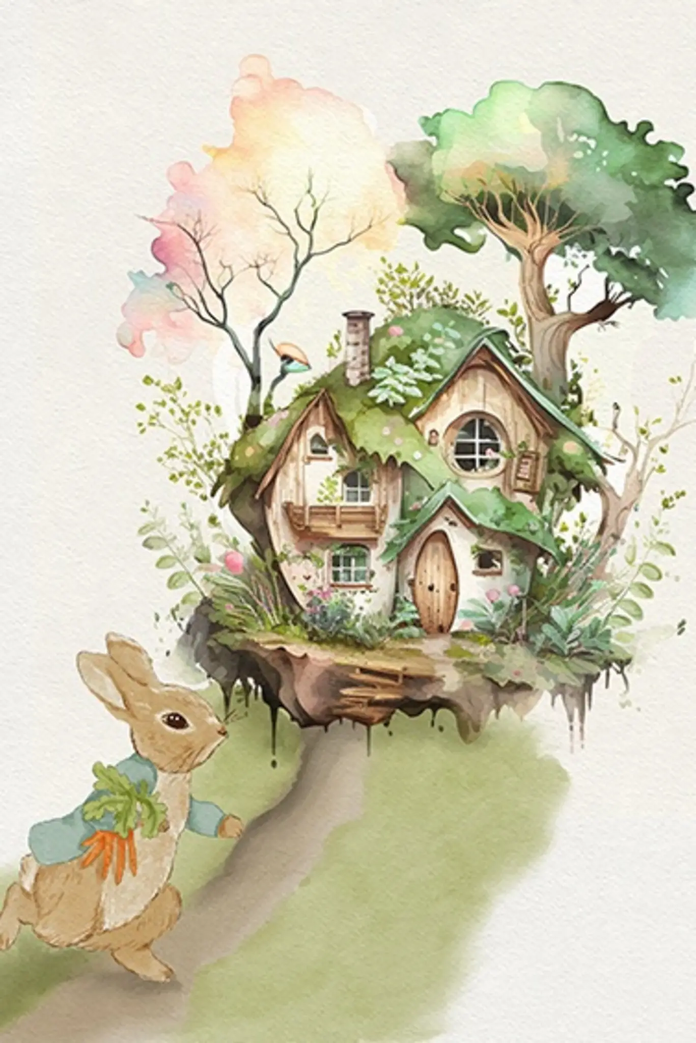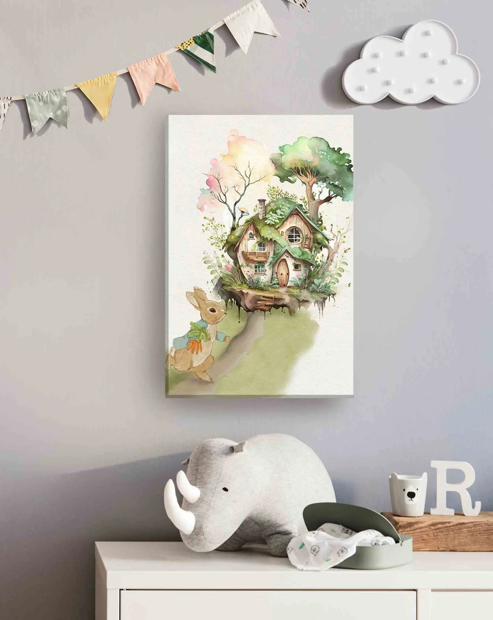Cuadro en lienzo canvas decorativo hermosa casita de conejo estilo acuarela