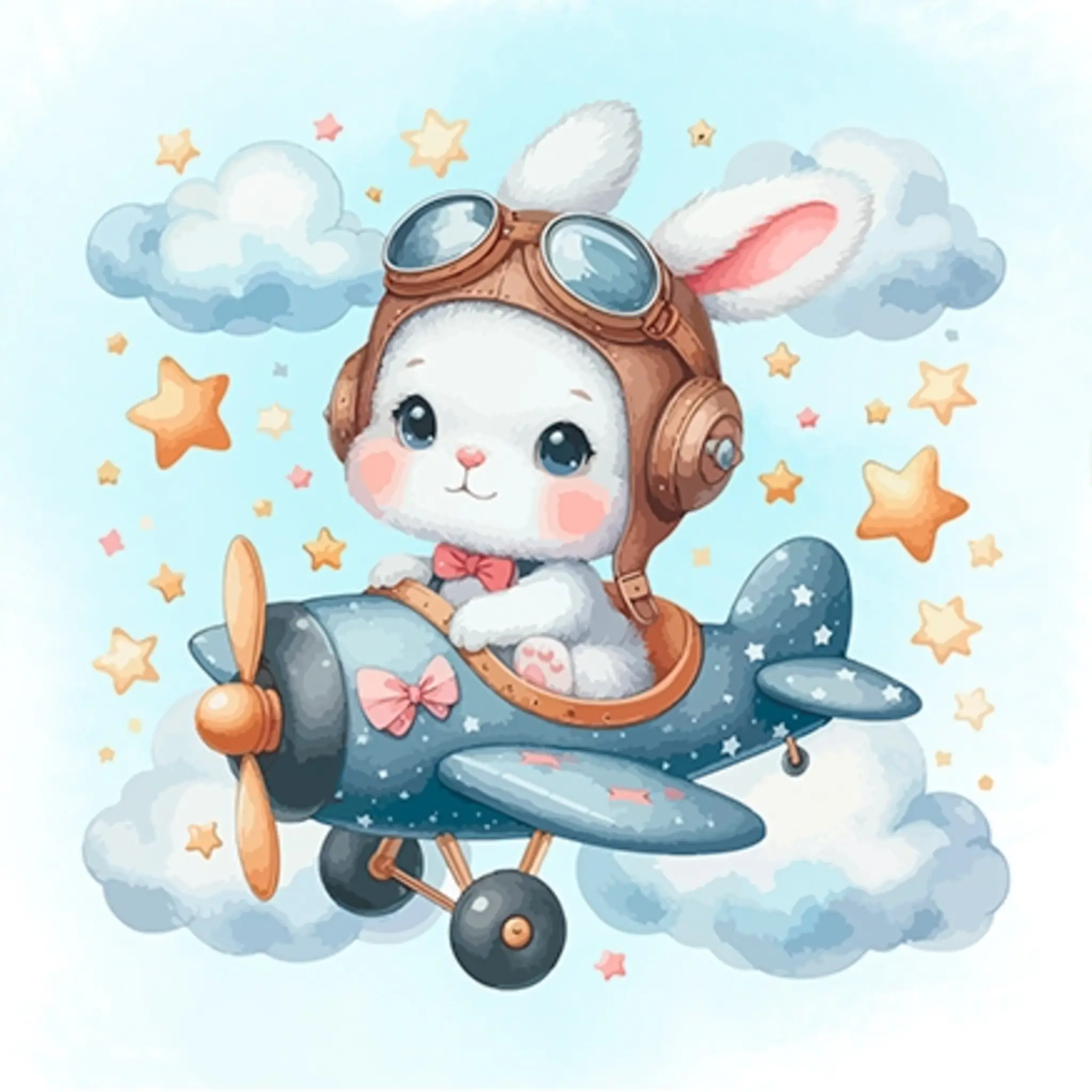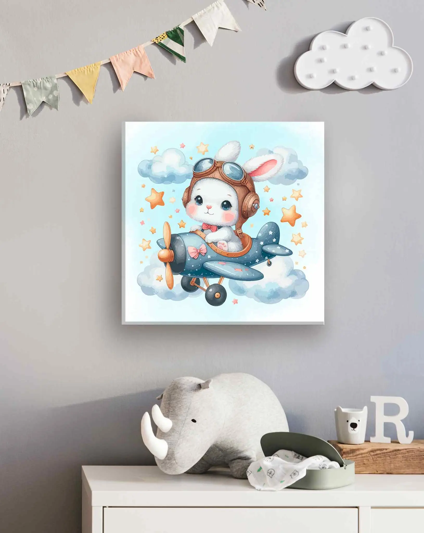 Cuadro en lienzo canvas decorativo conejito sobre avión fondo azul