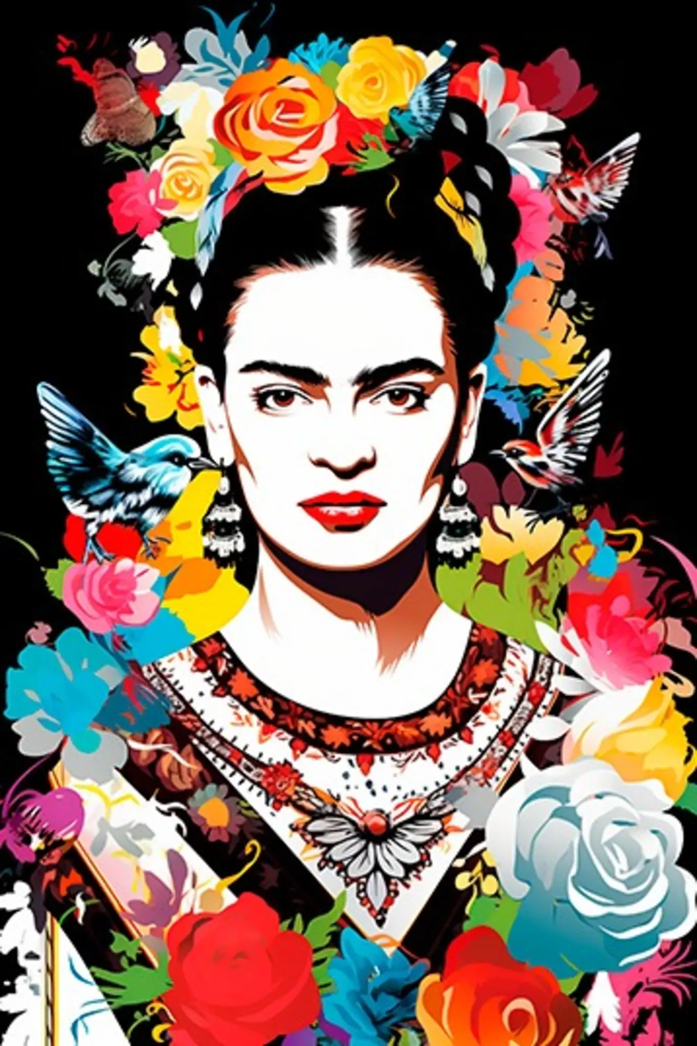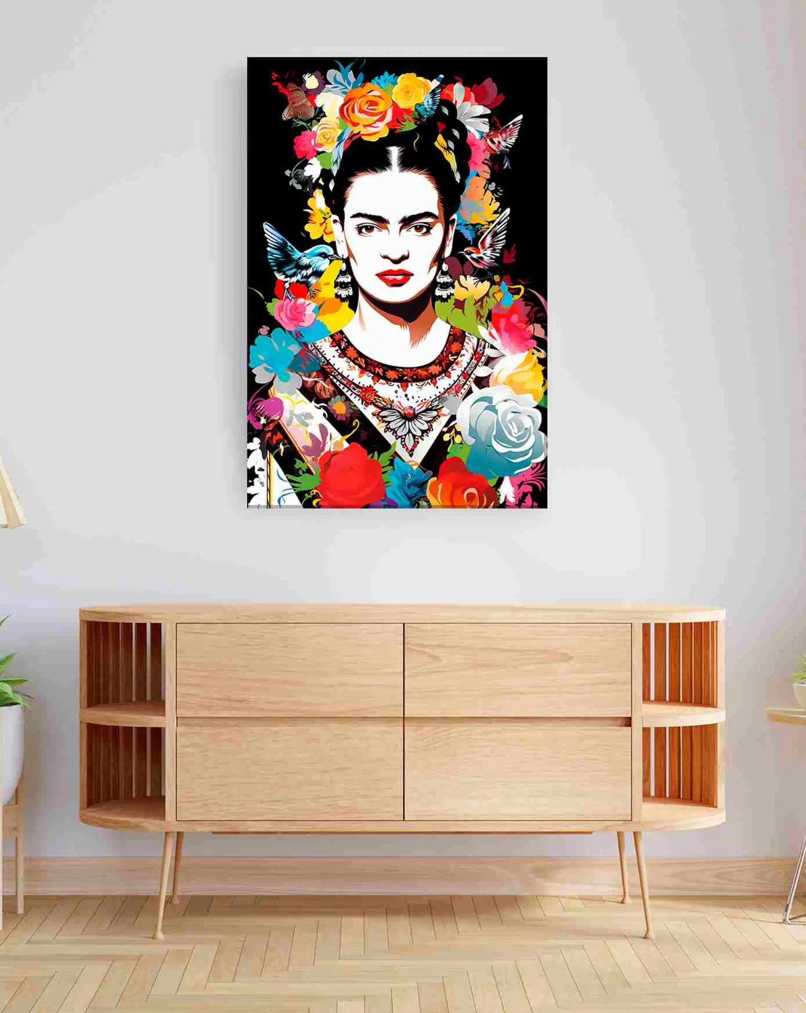 Cuadro en lienzo canvas decorativo Frida rodeada de flores en vibrantes colores con fondo negro