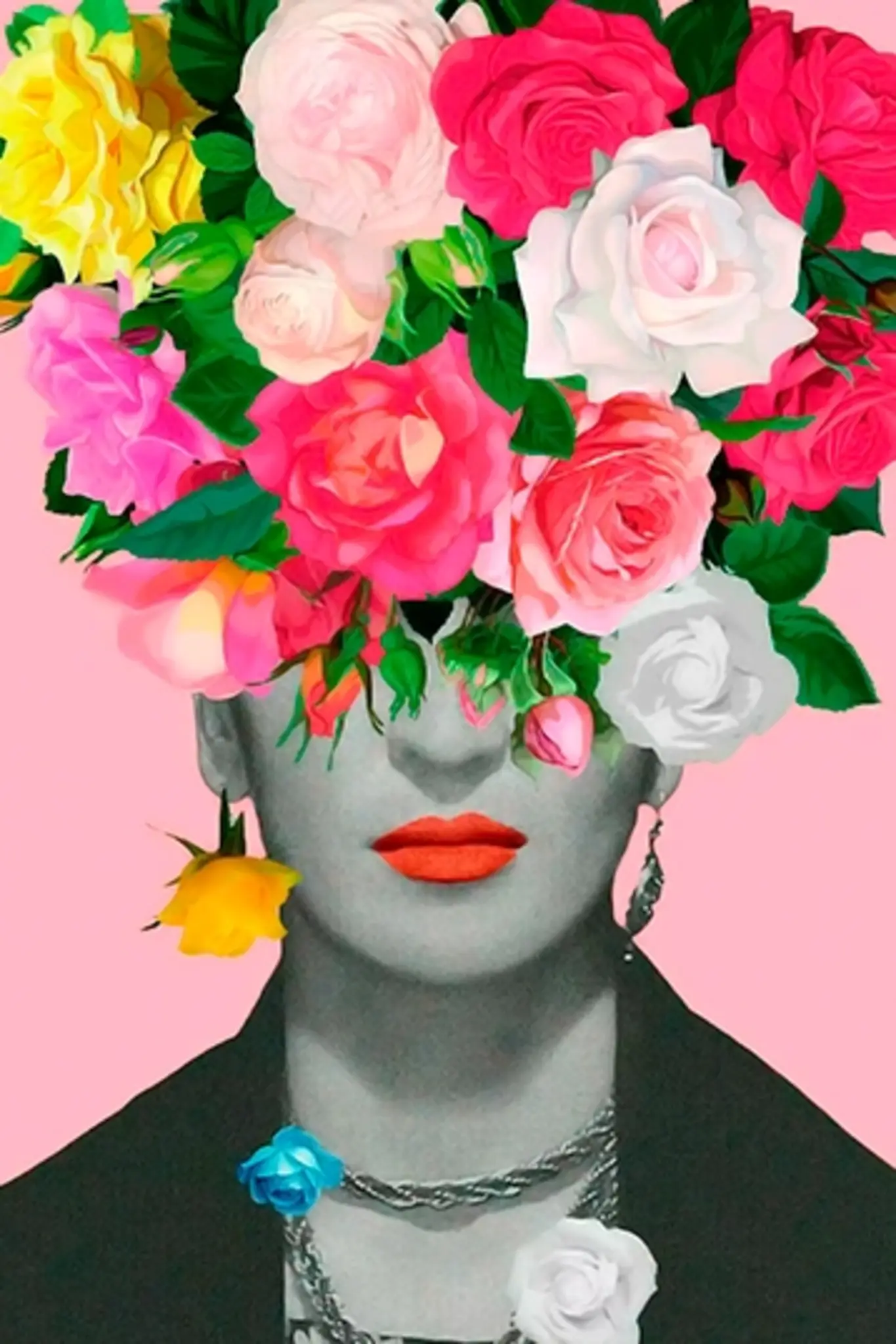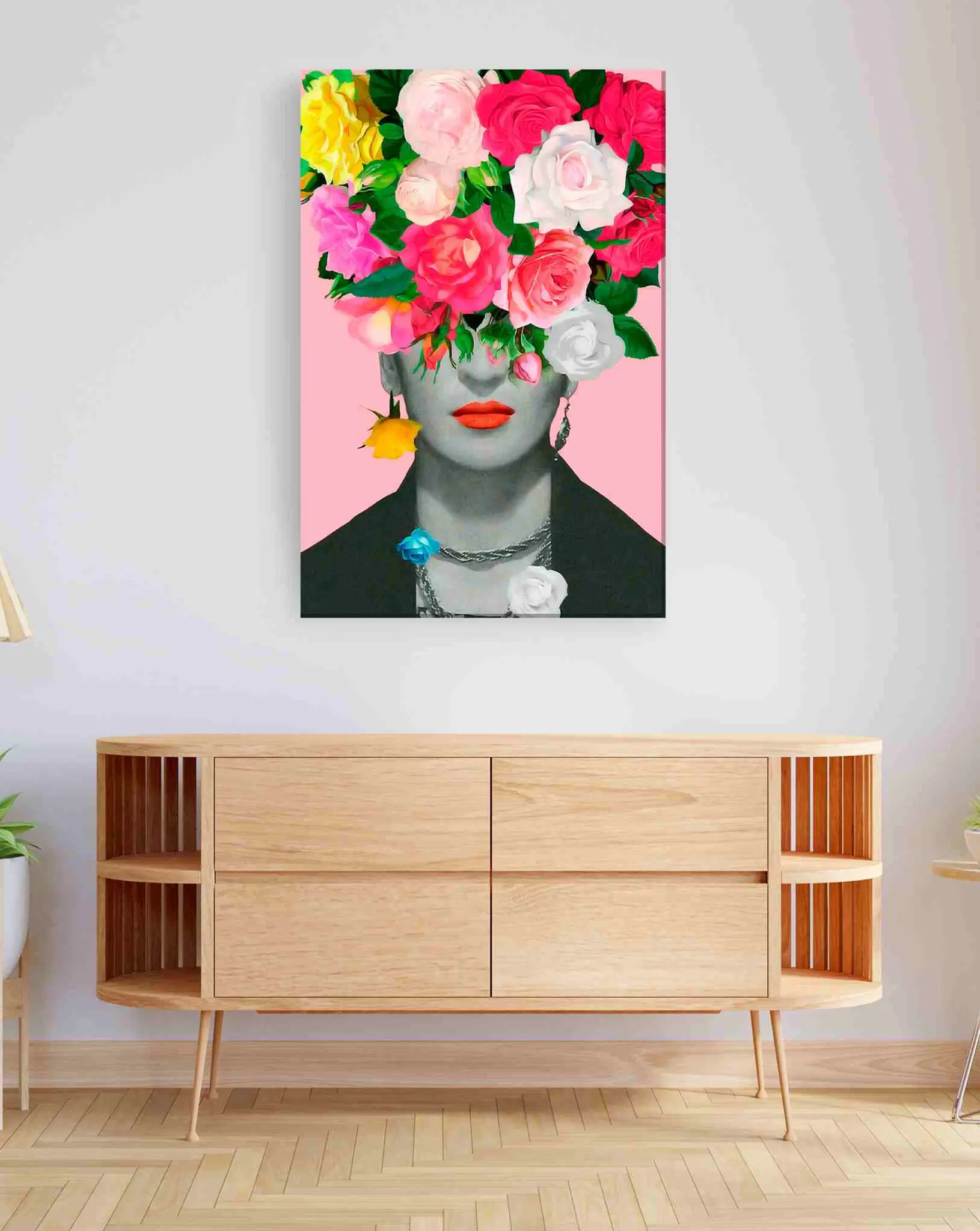 Cuadro en lienzo canvas decorativo Frida rostro flores rosas