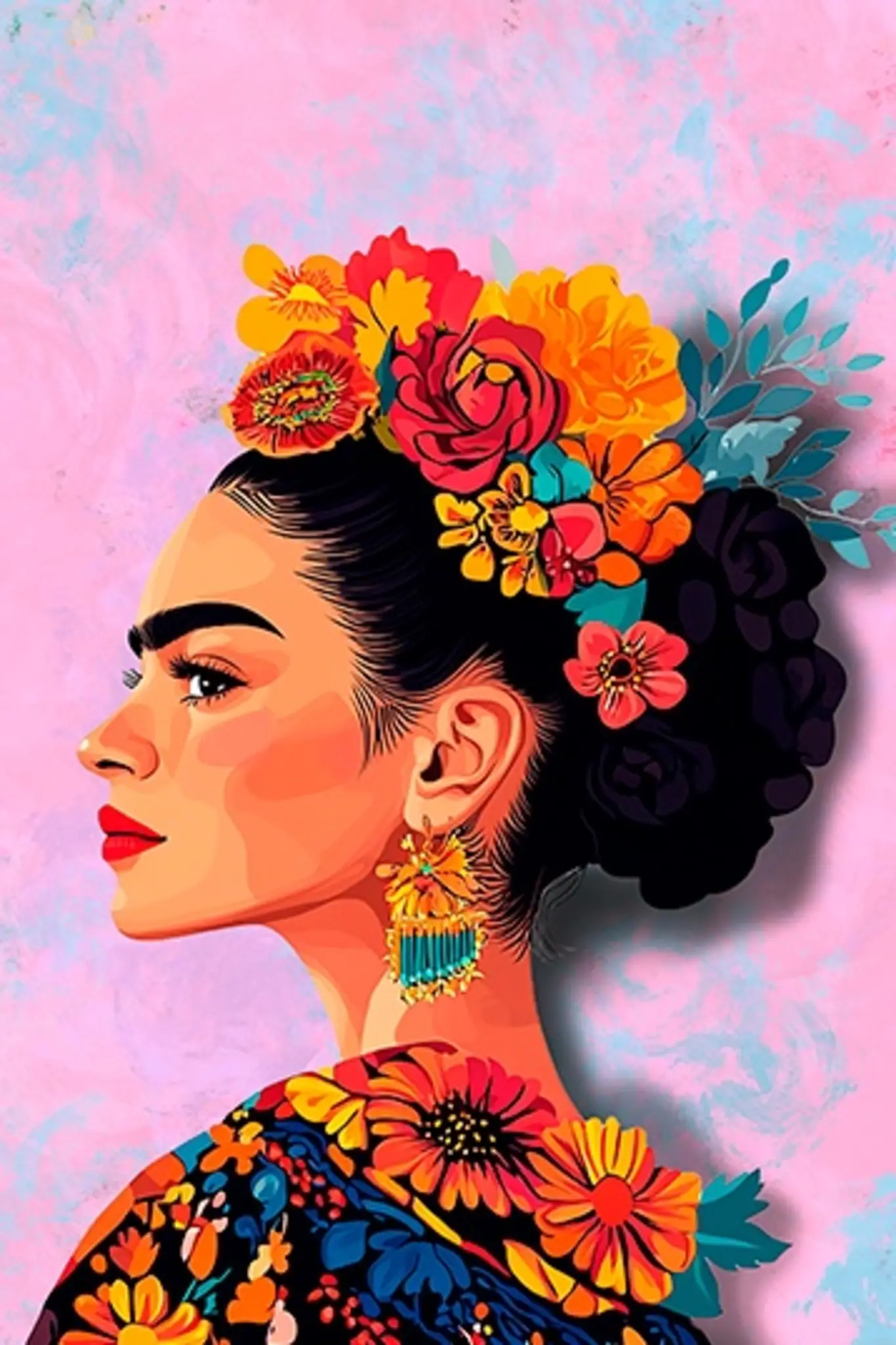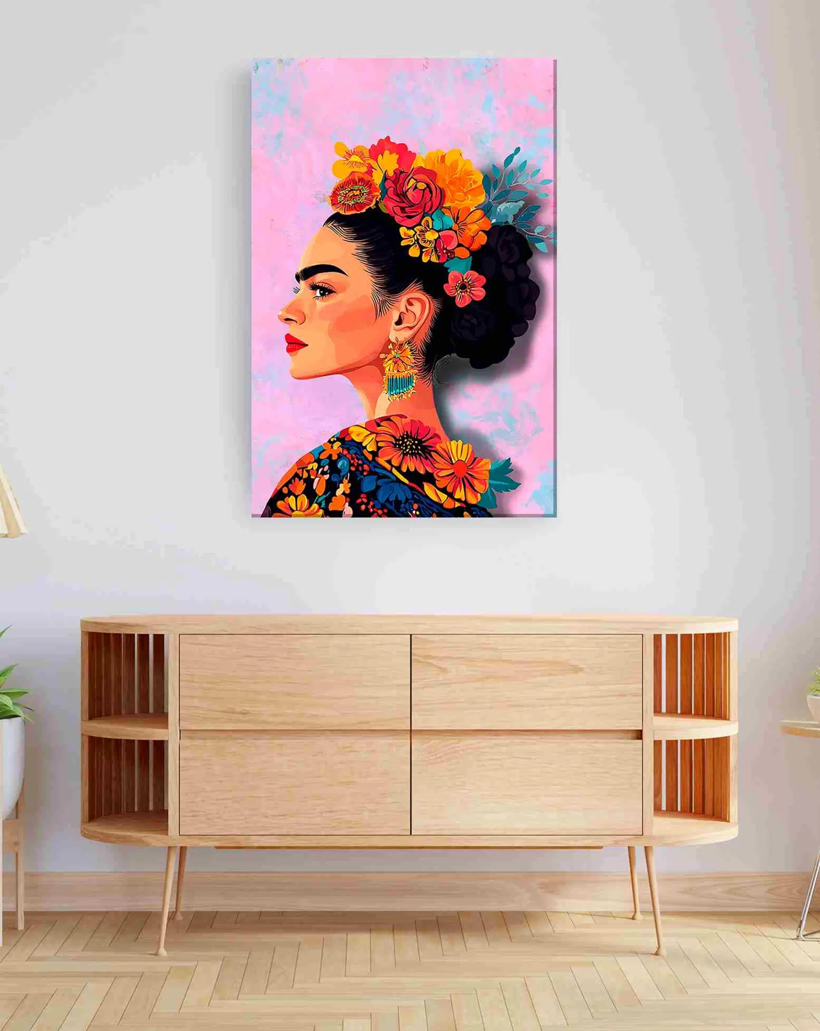 Cuadro en lienzo canvas decorativo Frida con coloridas flores fondo en tonos pastel