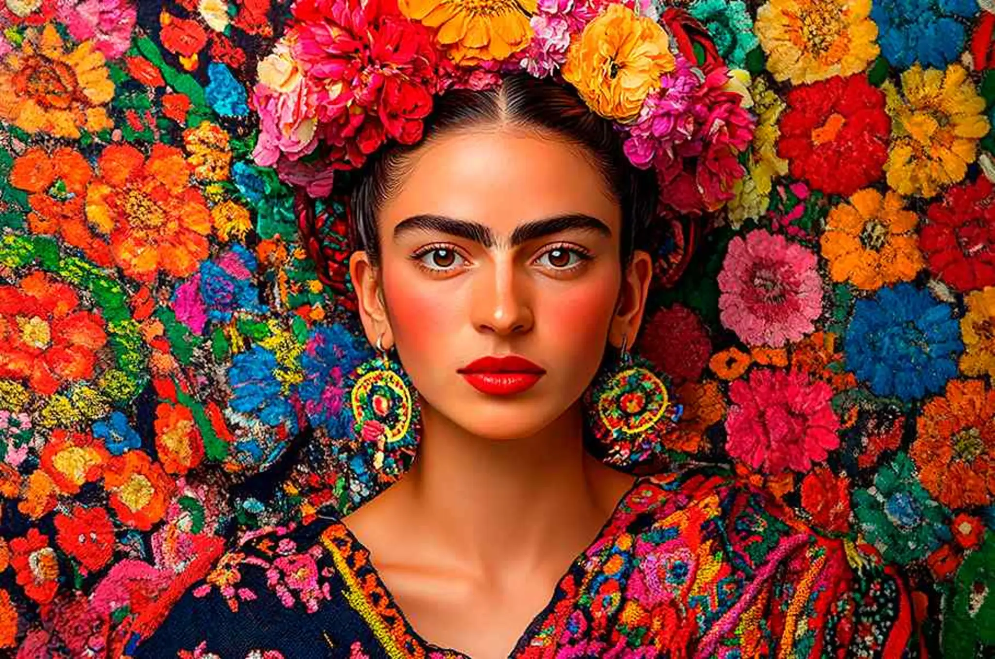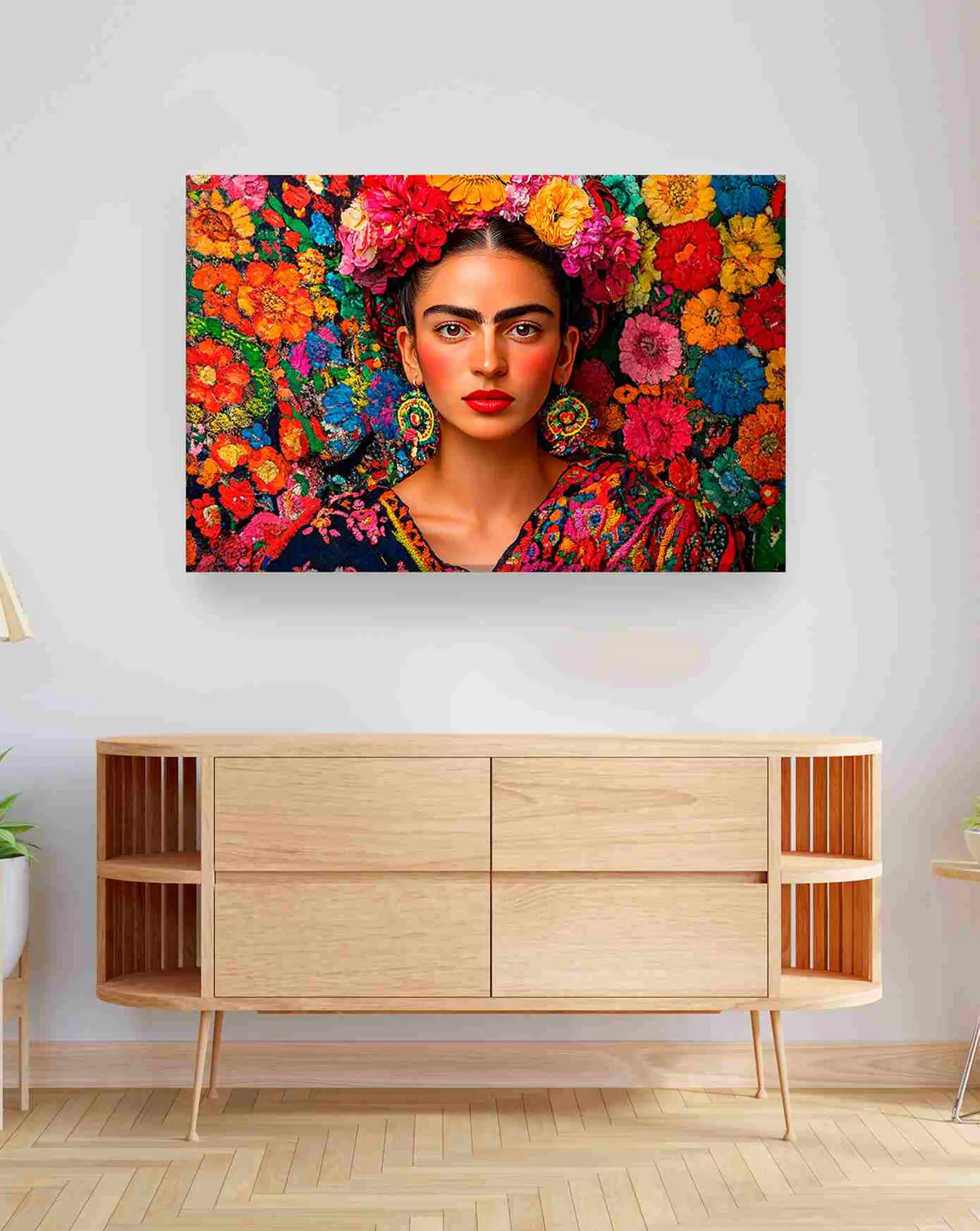 Cuadro en lienzo canvas decorativo Frida rodeada de flores estilo mural