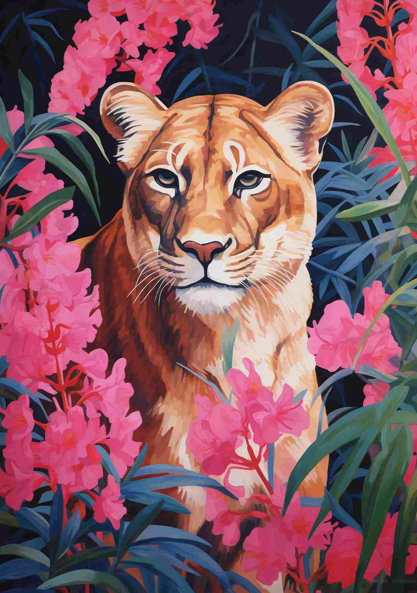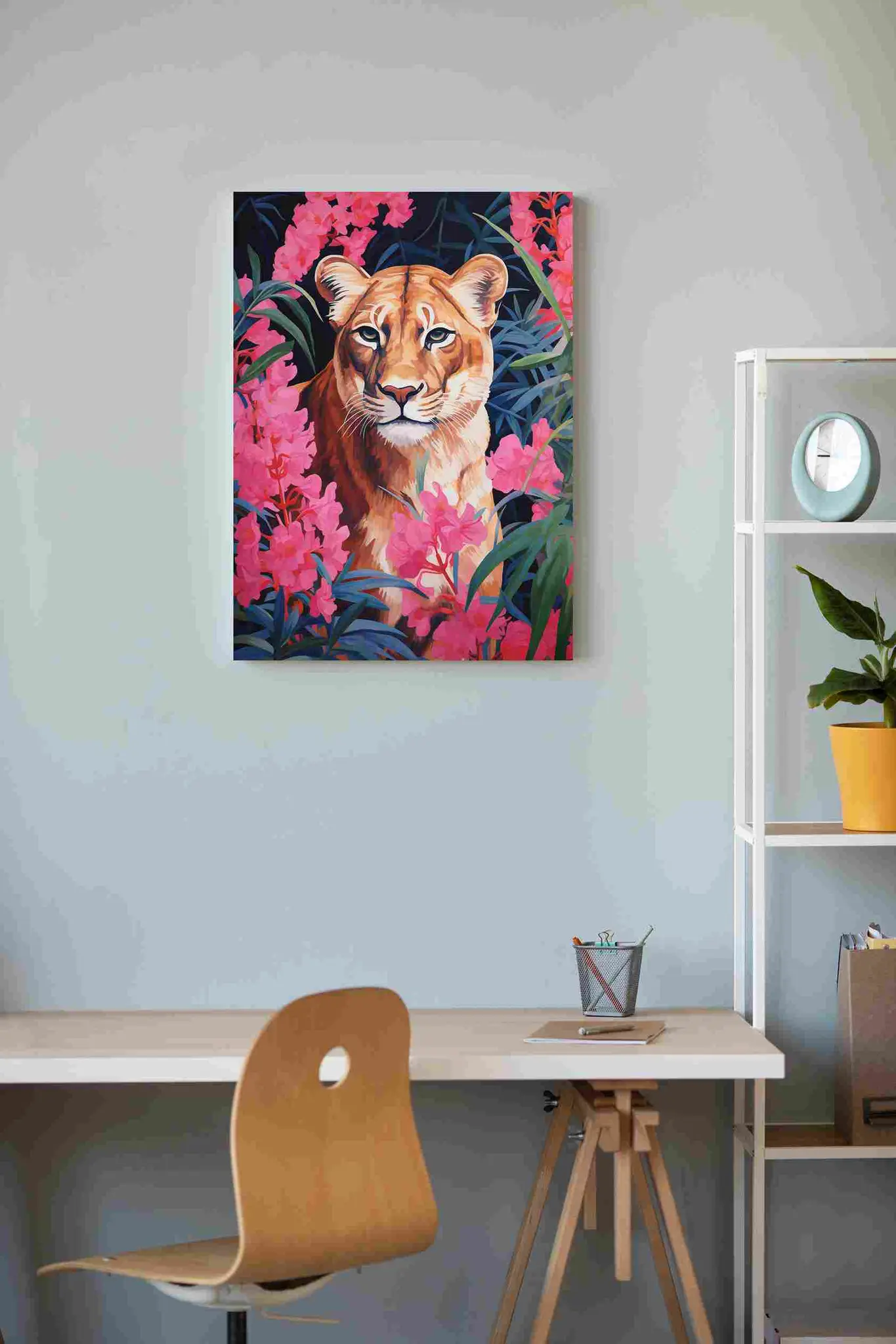 Cuadro en lienzo canvas decorativo leona rodeada de flores rosa