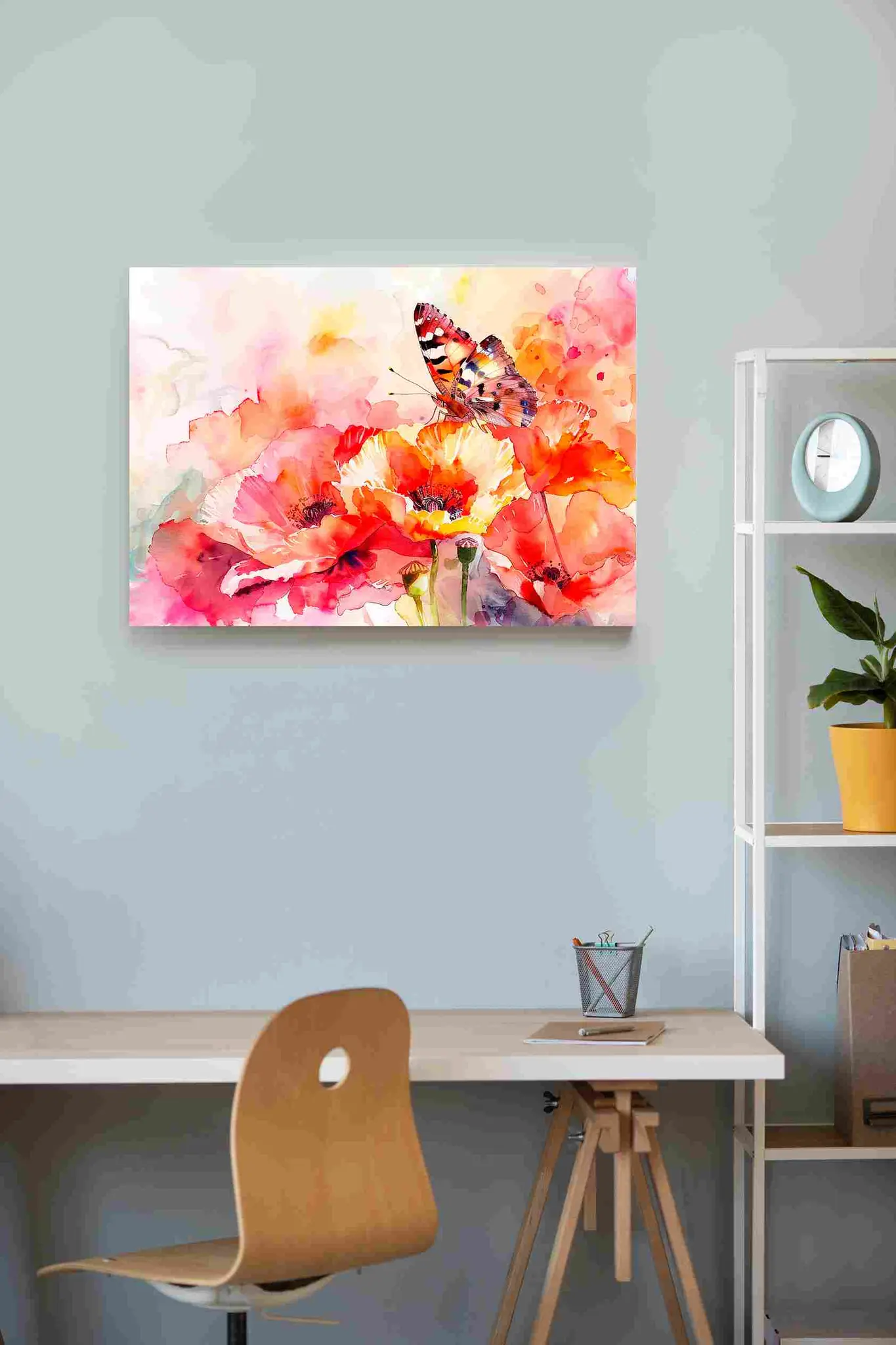 Cuadro en lienzo canvas decorativo mariposa sobre flores color naranja