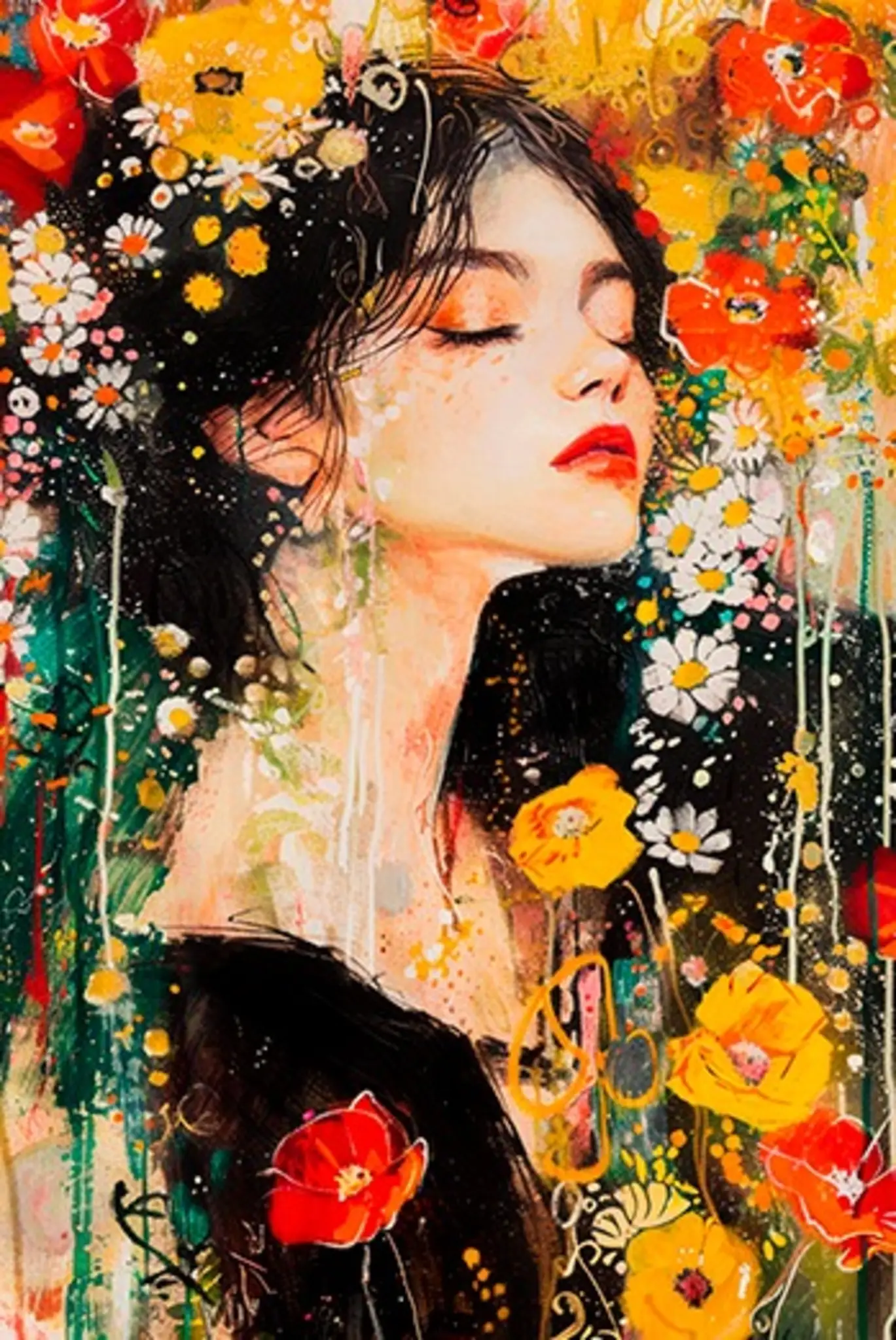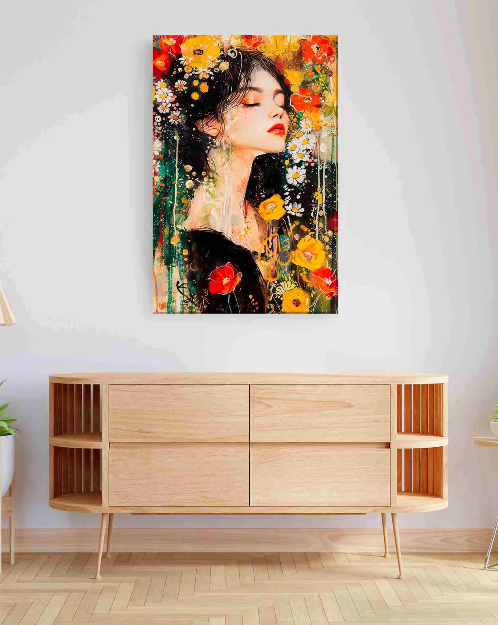Cuadro en lienzo canvas decorativo mujer con cabello negro rodeada de flores