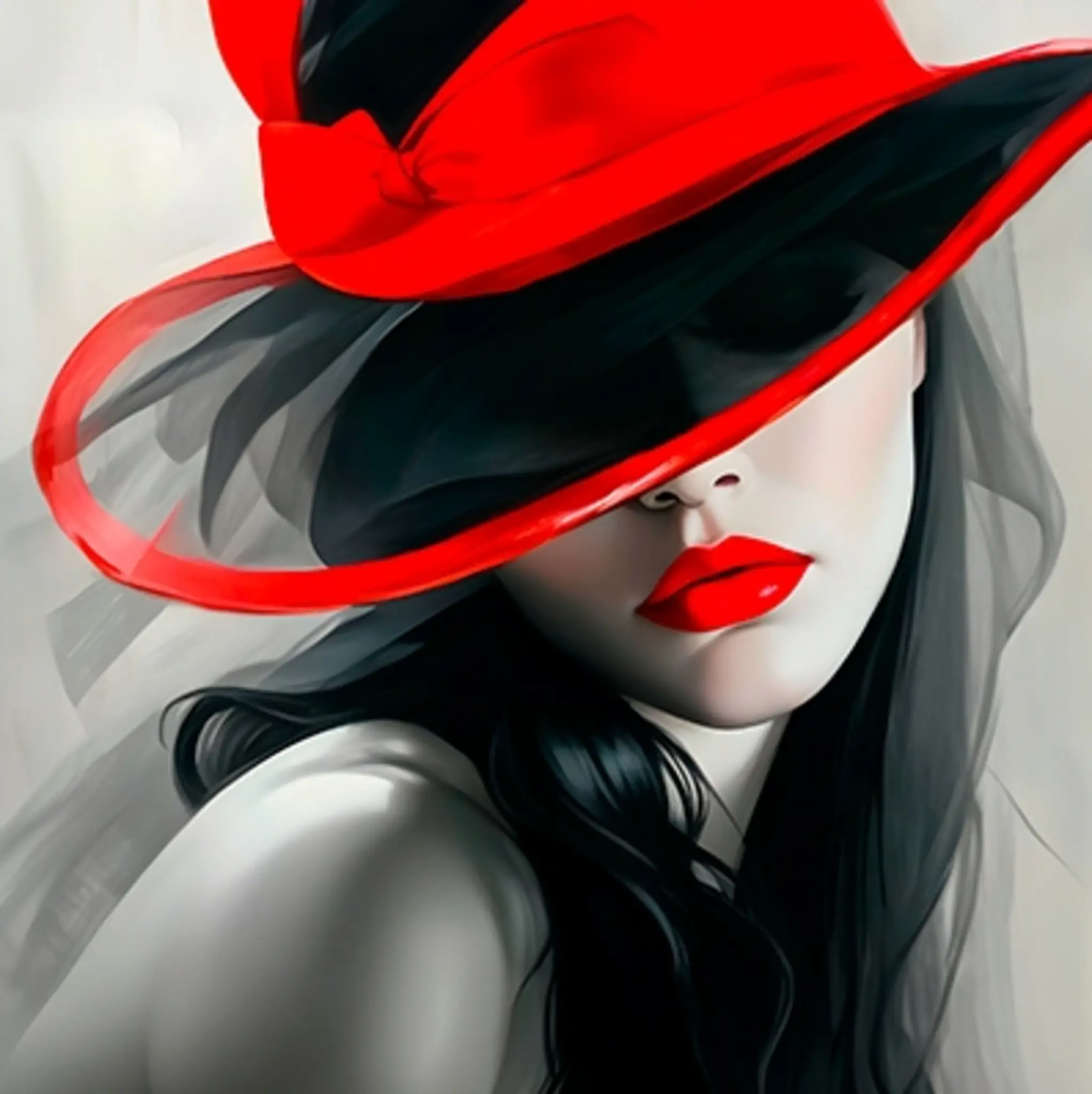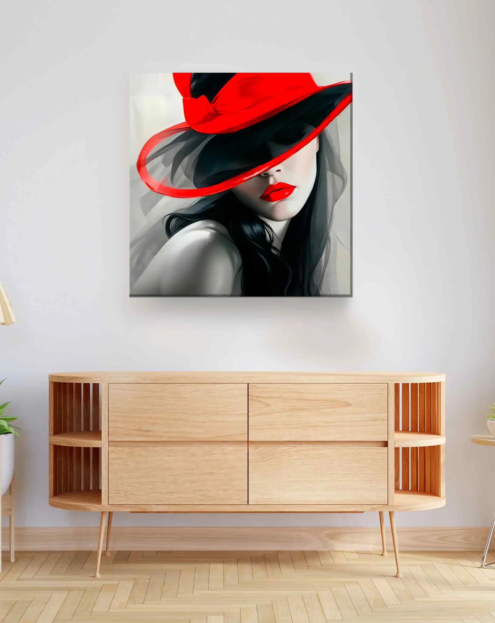 Cuadro en lienzo canvas decorativo mujer con sombrero tonos negro y rojo