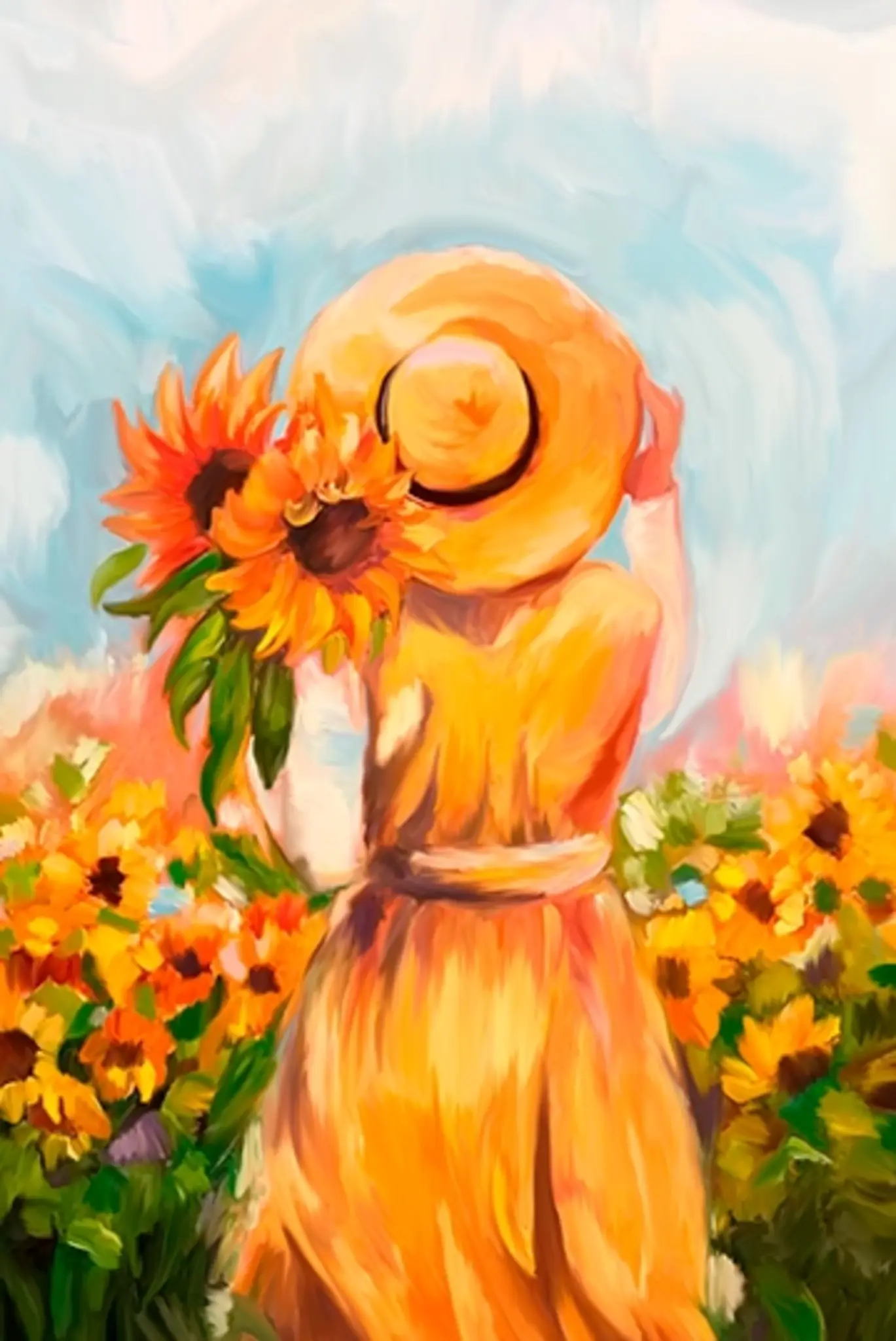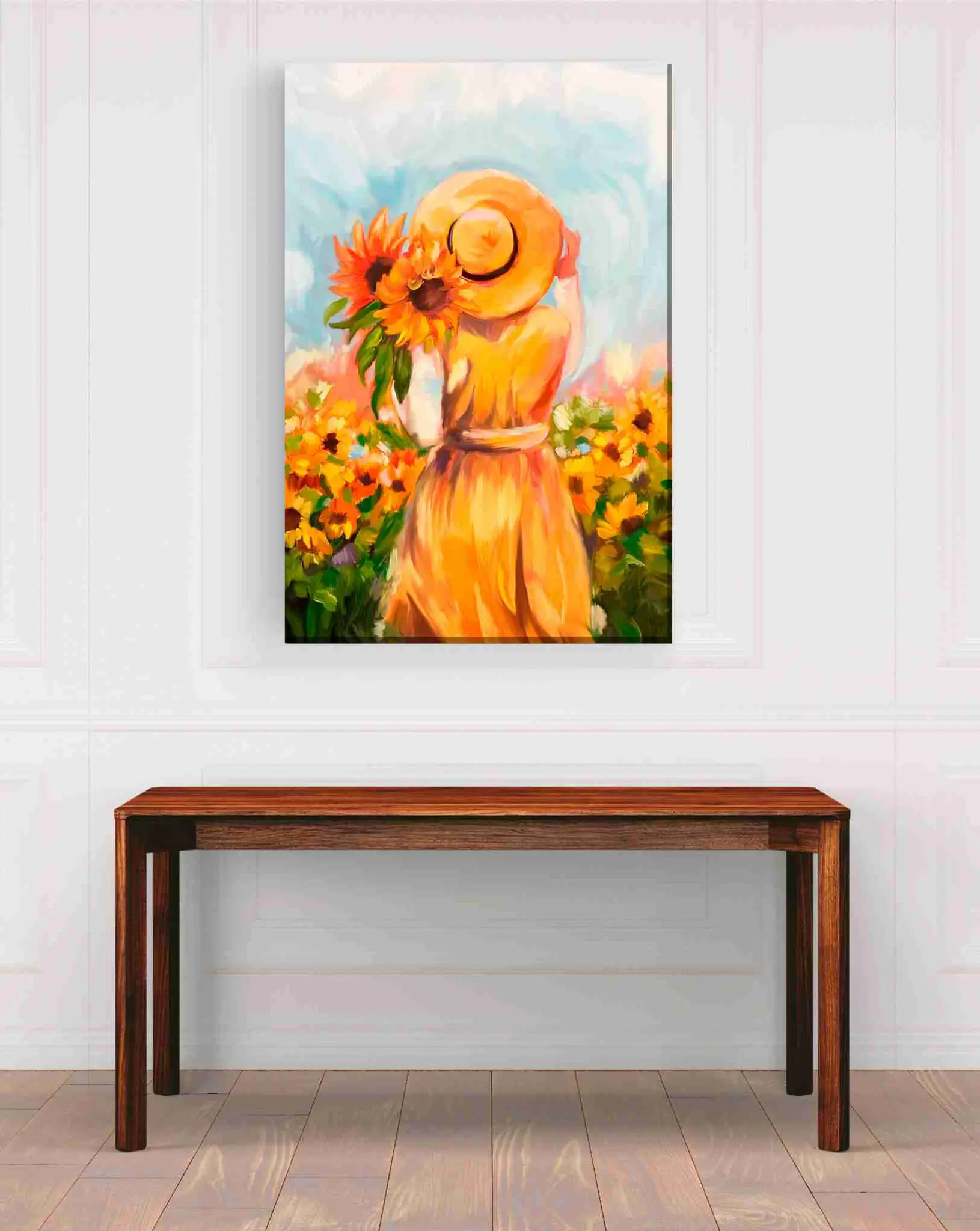 Cuadro en lienzo canvas decorativo niña rodeada de girasoles estilo pinceladas