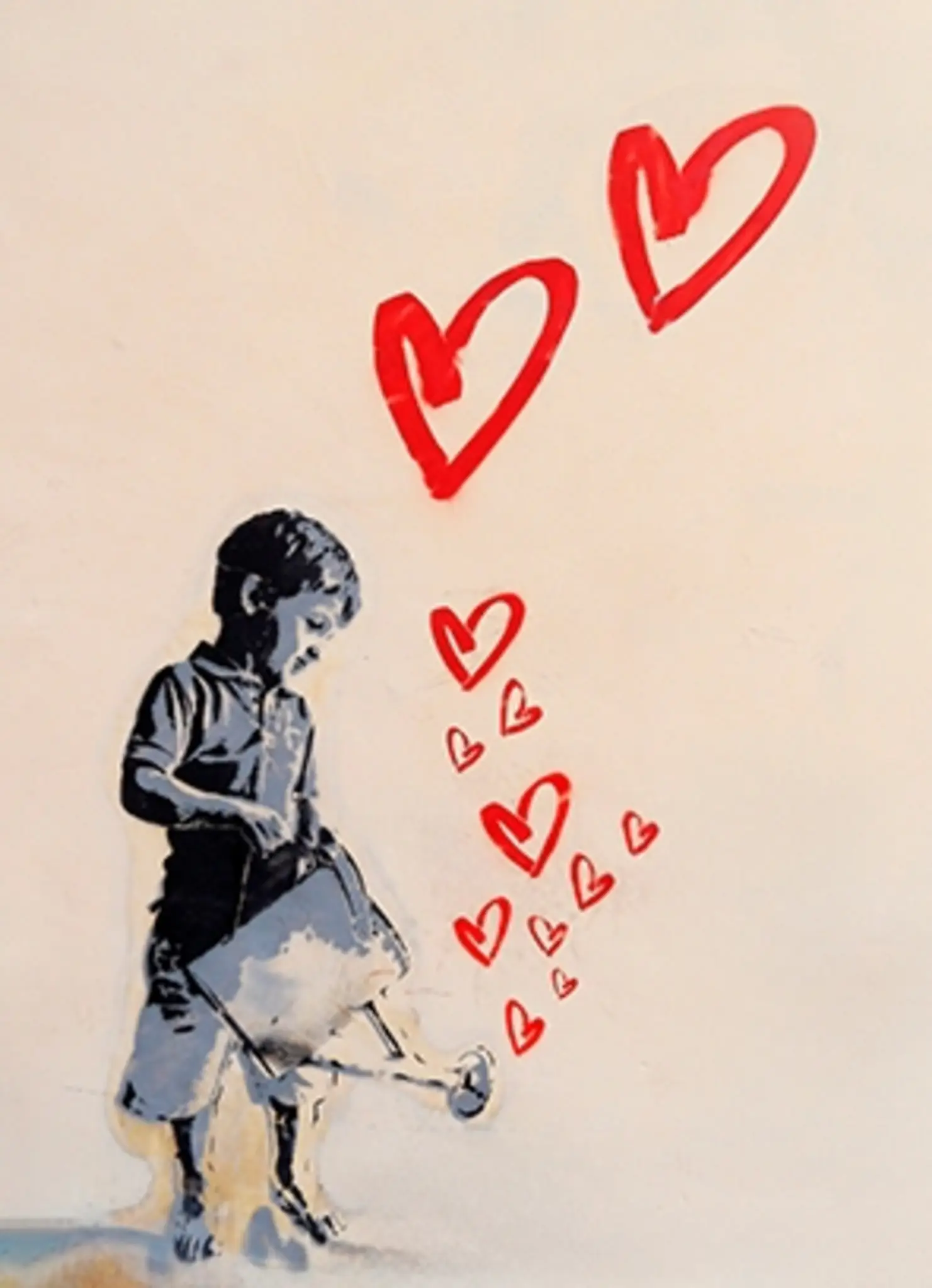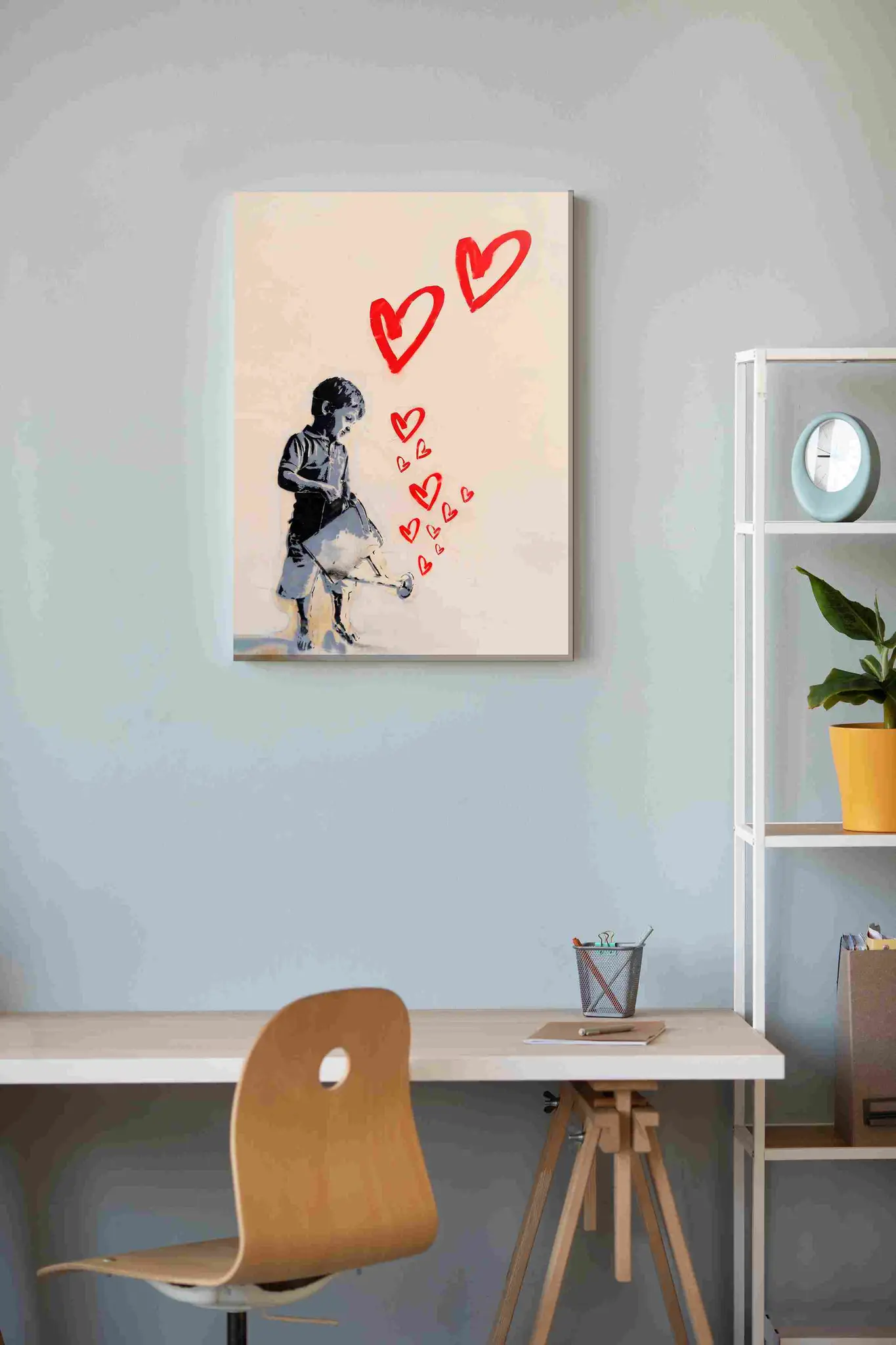 Cuadro en lienzo canvas decorativo hermoso niño regando corazones delineados en rojo