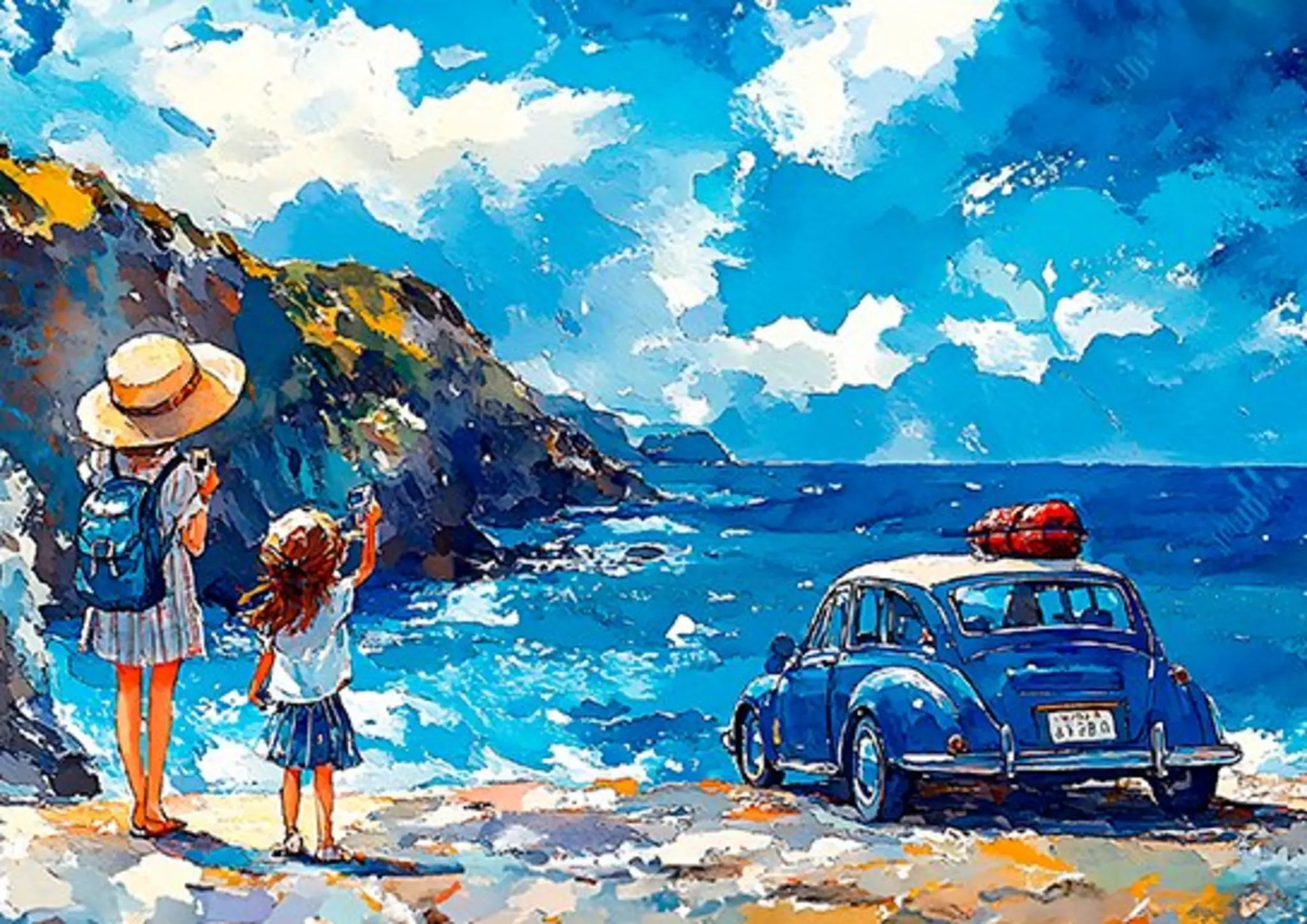 Vocho azul playa acuarela